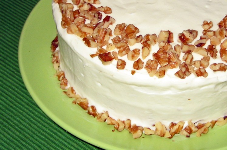 A partir de aquí, la imaginación de cada uno para montar la tarta de una manera original. Yo no sé hacer zanahorias ideales de fondant, así que unto una parte del bizcocho, pongo la otra capa de bizcocho encima, lo cubro todo de crema y le añado unas nueces de adorno.