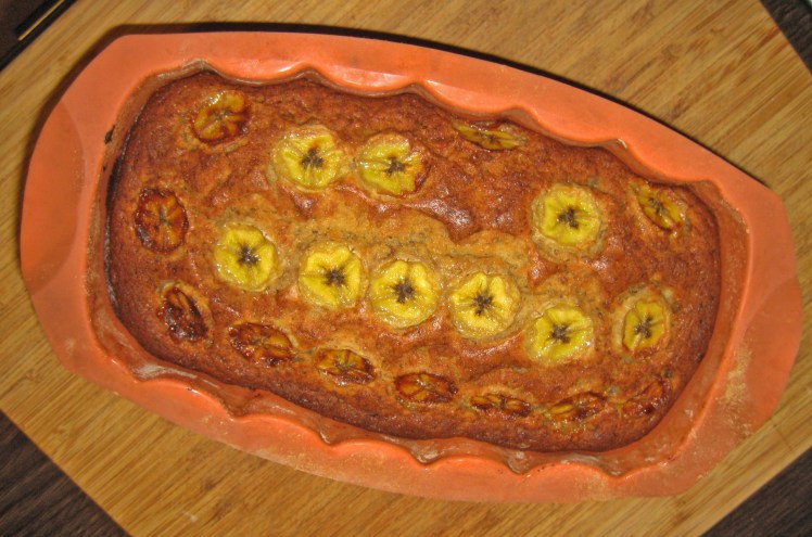 Como siempre, engrasamos el molde, para que no se nos pegue el bizcocho, y echamos la mezcla intentando que se quede la superficie recta. A mi me encantó la presentación que hicieron del bizcocho en el blog del que obtuve la receta así que, igual que ellos, os sugiero colocar unas rodajas de plátano en el centro.