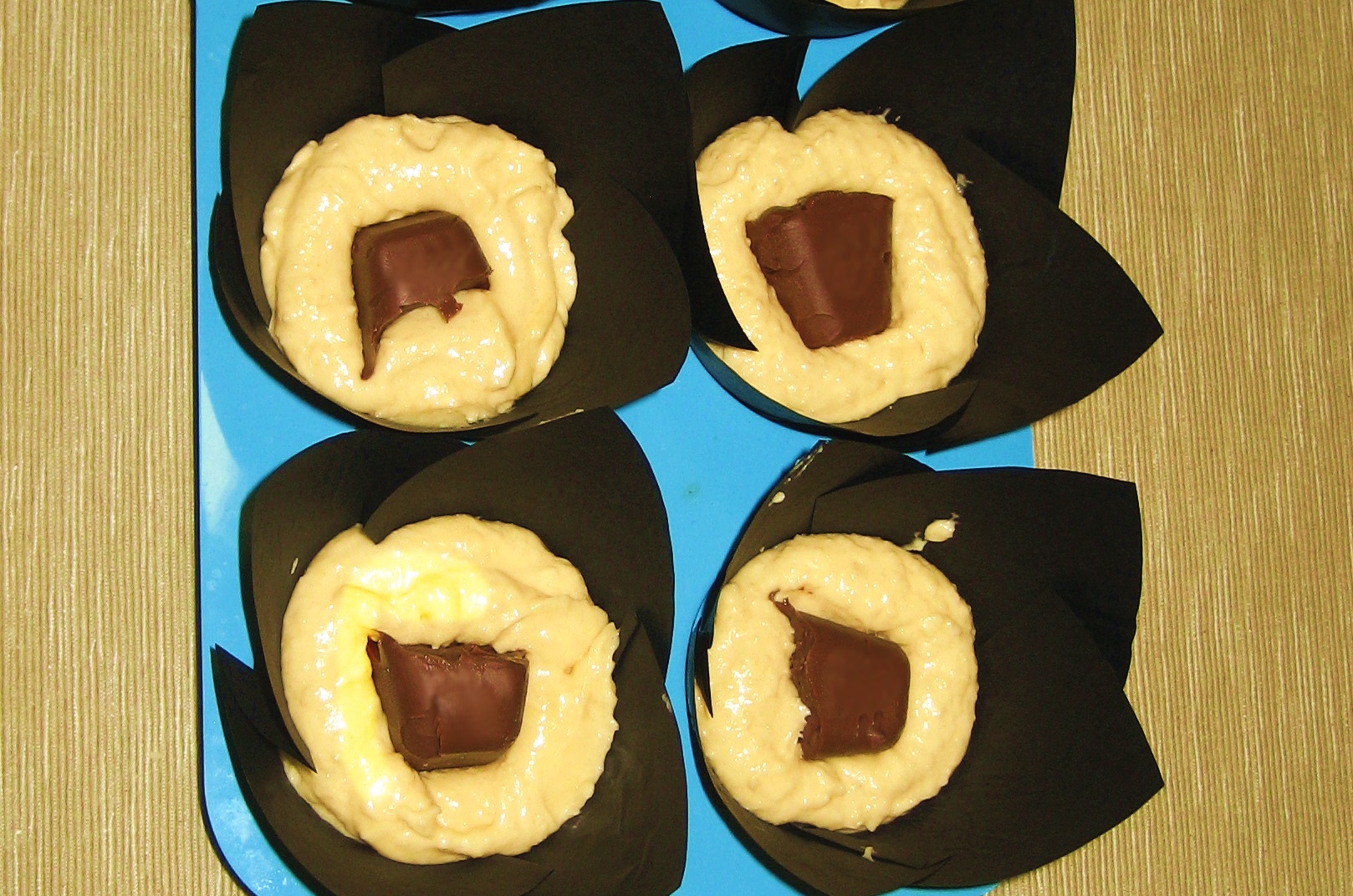 Una vez repartida la masa entre los moldes introducimos cada “cubito” congelado de Nocilla en uno de los bizcochones. Y lo empujamos un poco hacia el fondo. Antes de meterlos al horno, deberían quedar como en la siguiente imagen: