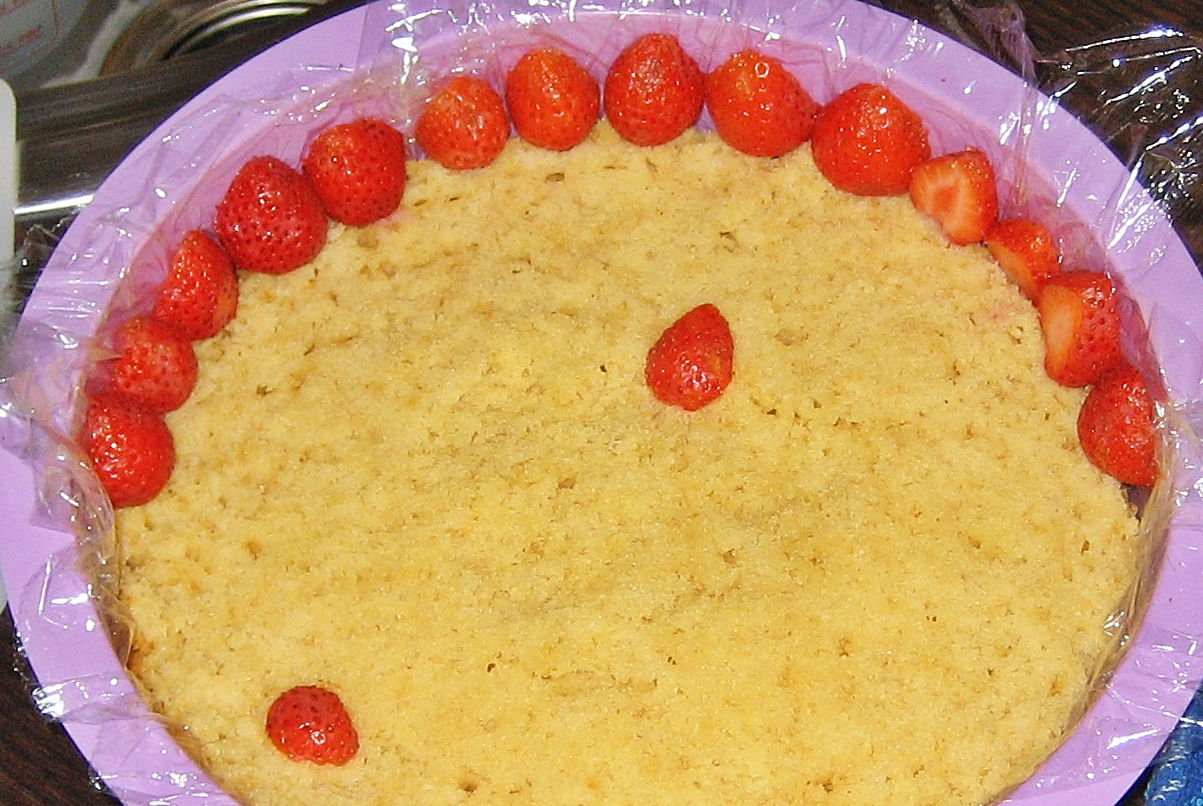 3. Cortamos el resto de fresas en dos o tres trozos y las repartimos por el centro.