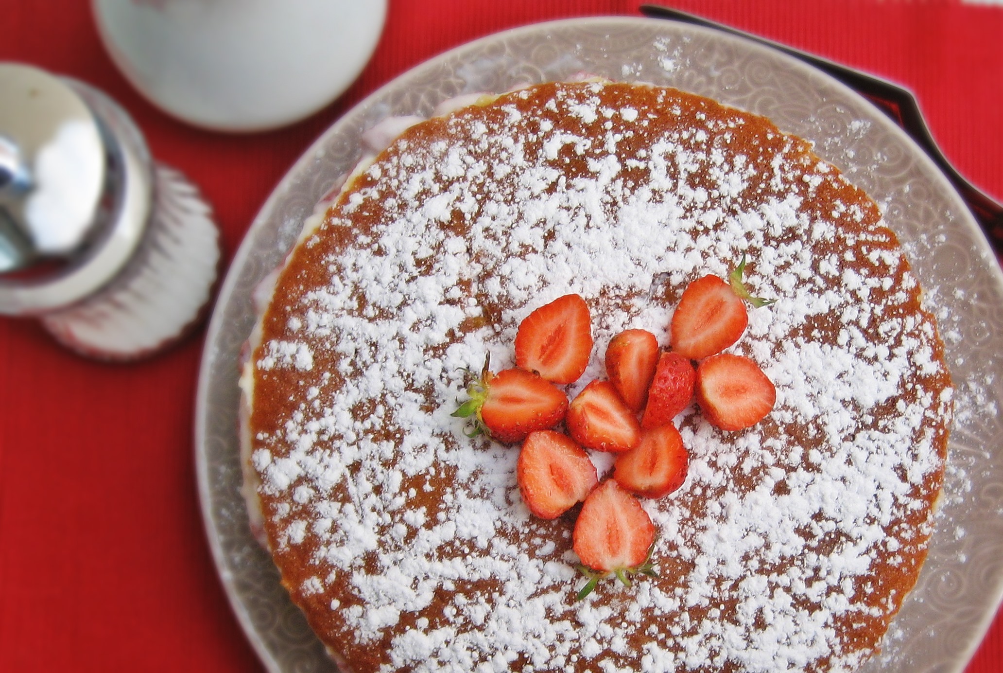Cuando vayamos a servir, desmoldamos nuestra tarta sobre un plato y luego volvemos a girar sobre otro plato (como cuando damos la vuelta a la tortilla, pero con más cuidado). Esparcimos un poco de azúcar glass por la superficie y colocamos unas pocas fresas en el centro a modo de adorno. Lo ideal es que se mantenga en la nevera hasta el momento de servir.