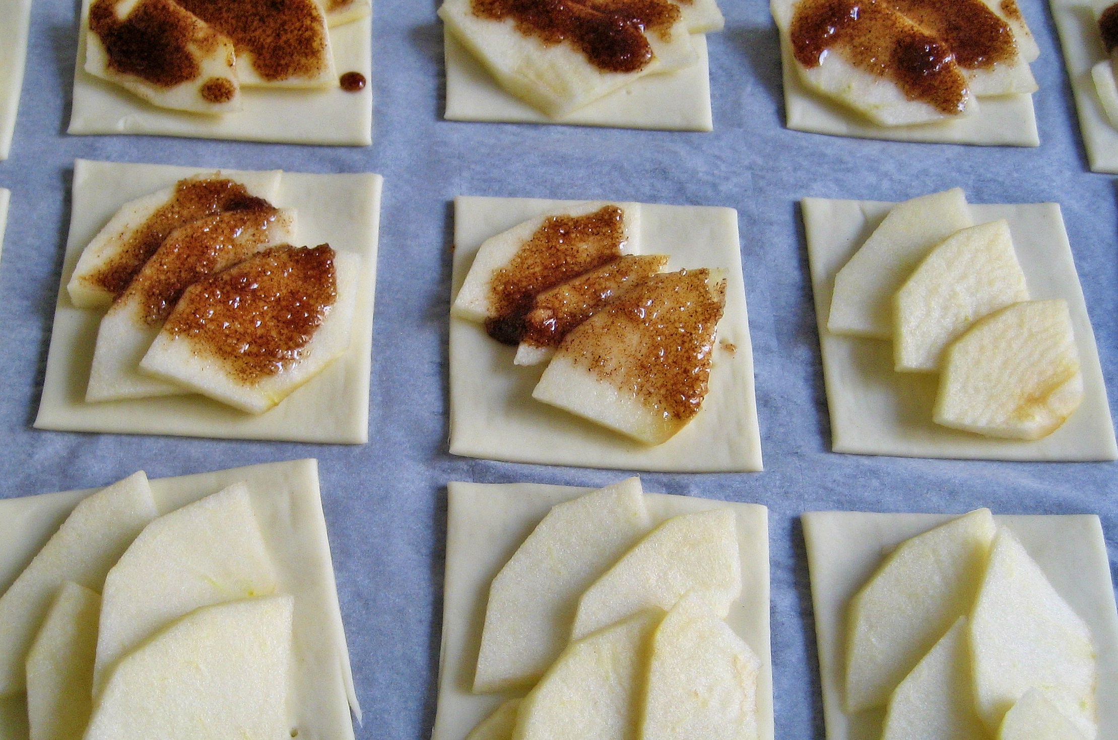 Como veis, no hace falta cubrir completamente cada pieza, con repartir un poco sobre la manzana en más que suficiente. Por último, batimos el huevo y untamos cada pieza, asegurándonos que el hojaldre queda cubierto.
