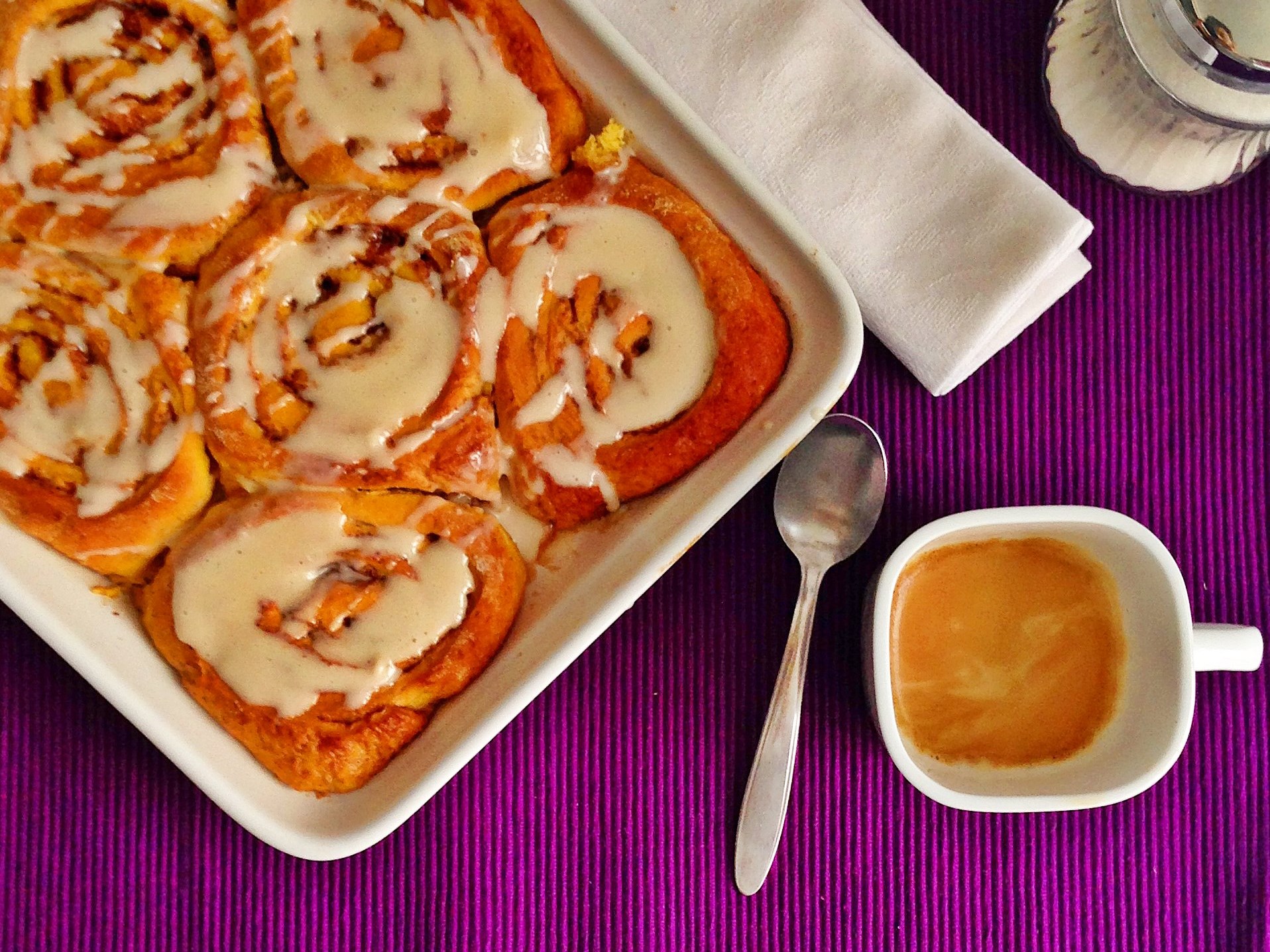 Por mi parte, he modificado un poco la cantidad de azúcar y mantequilla, he cambiado el glaseado y he sustituido parte de los huevos por puré de calabaza asada. El objetivo es intentar que los rollos sean un poco más ligeros y, a la vez, ir dando uso a la calabaza que tengo en casa. Era eso o pedirle que pague parte de la hipoteca.