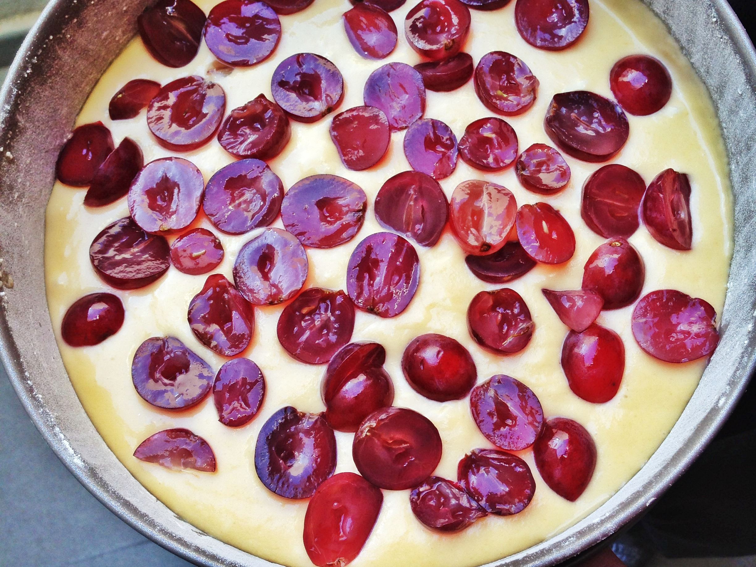 Vertemos nuestra masa sobre el molde y repartimos las uvas por encima, cubriendo la superficie de la que será nuestra tarta. El resultado sería, más o menos, como se muestra en la siguiente foto.
