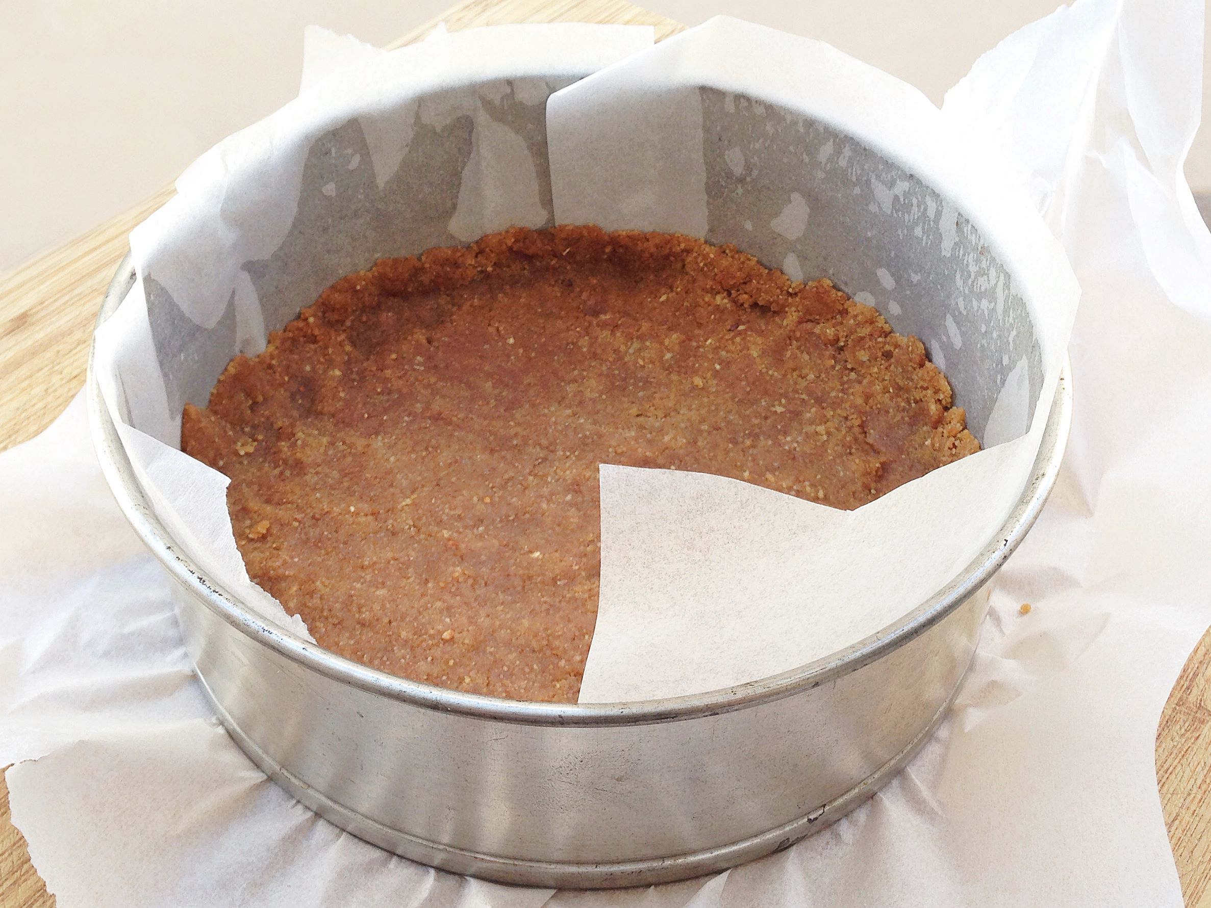 Si nuestra base de galletas está ya fría, podemos verter la masa en el molde, si no, hay que esperar un poco.
