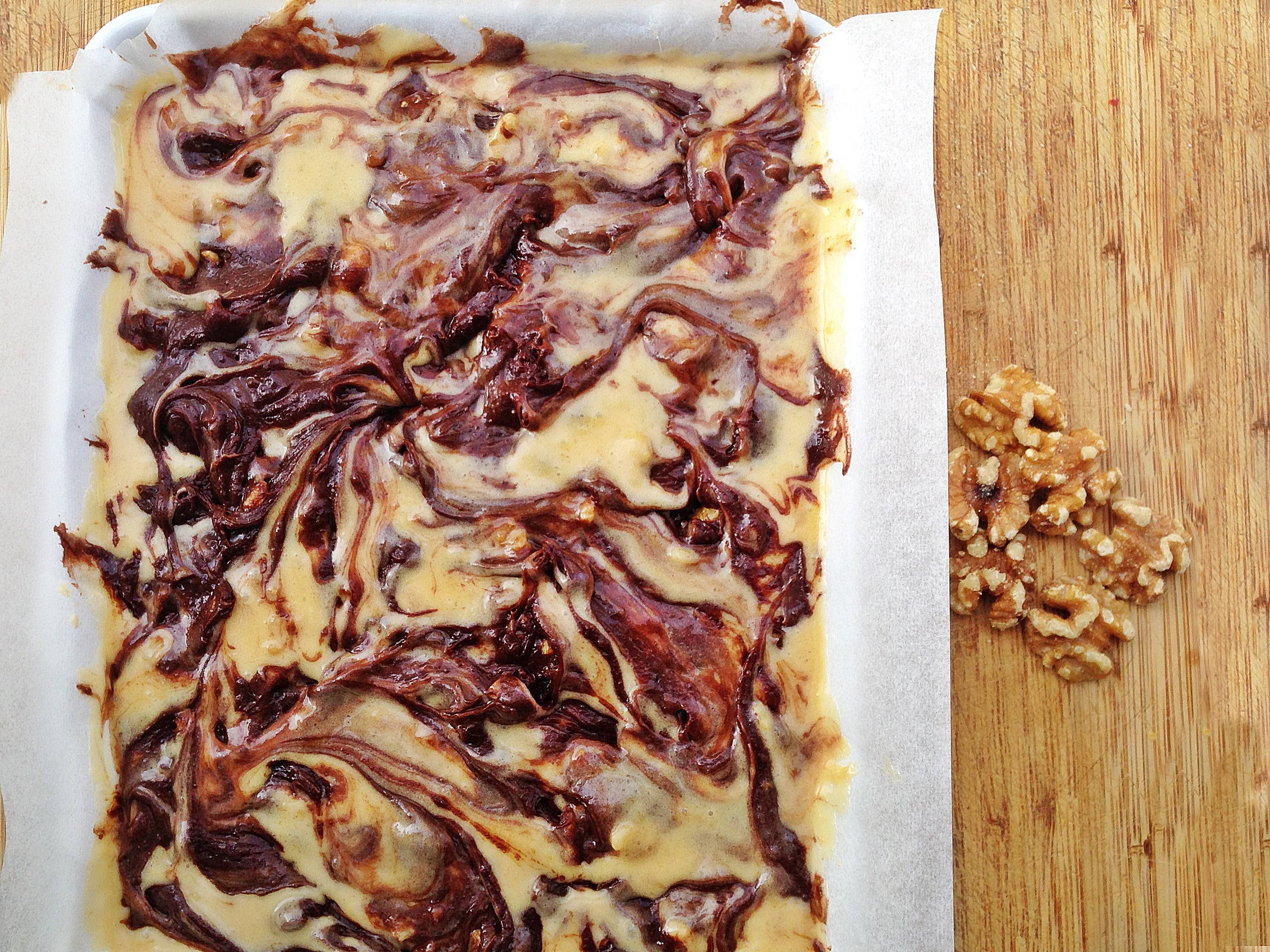 Vertemos primero nuestra masa de chocolate blanco en el molde (estará bastante líquida) y luego, por encima, vertemos la de chocolate negro, que estará bastante más densa. Con ayuda de un tenedor, hacemos unos dibujillos en la masa para que se mezcle un poco. Más o menos como en la siguiente imagen: