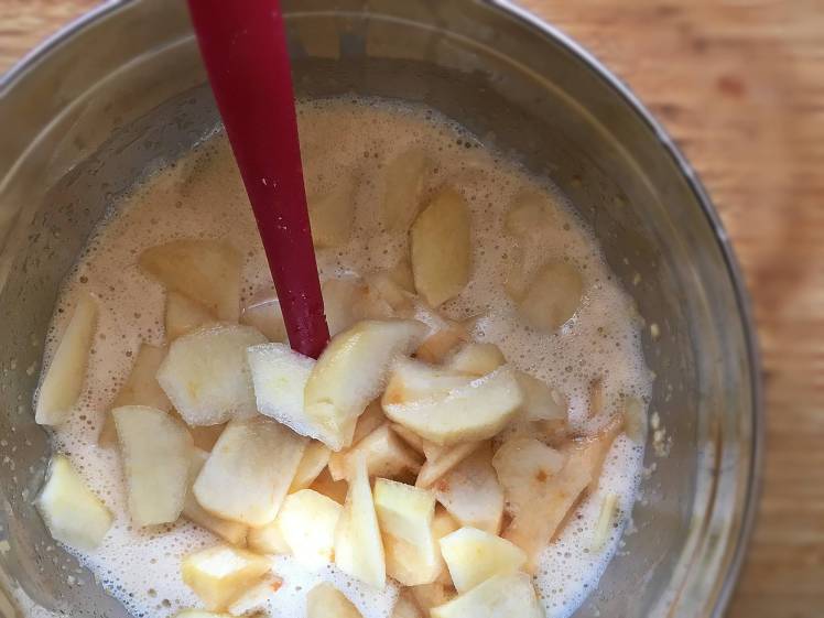 Añade la mezcla de avena con leche y la levadura y bate hasta que se integre todo. Por último, pela y trocea las peras y mézclalas con el resto de la masa. Como ves, la cantidad de peras es muy grande, por lo que será lo que le de «cuerpo» a nuestro bizcocho.